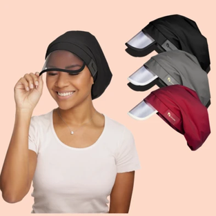 Hairbrella is made of 100% microfiber and is the first satin lined rain hat that protects your hairstyle! It also has a visor that also protects you face from the elements. To make Hairbrella even more functional, it flips inside out to become its own carrying case!! So it fits just right in your purse, gym bag, baby bag, etc!